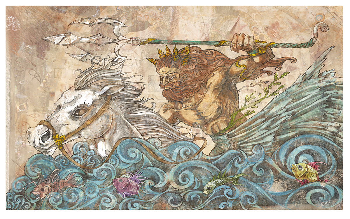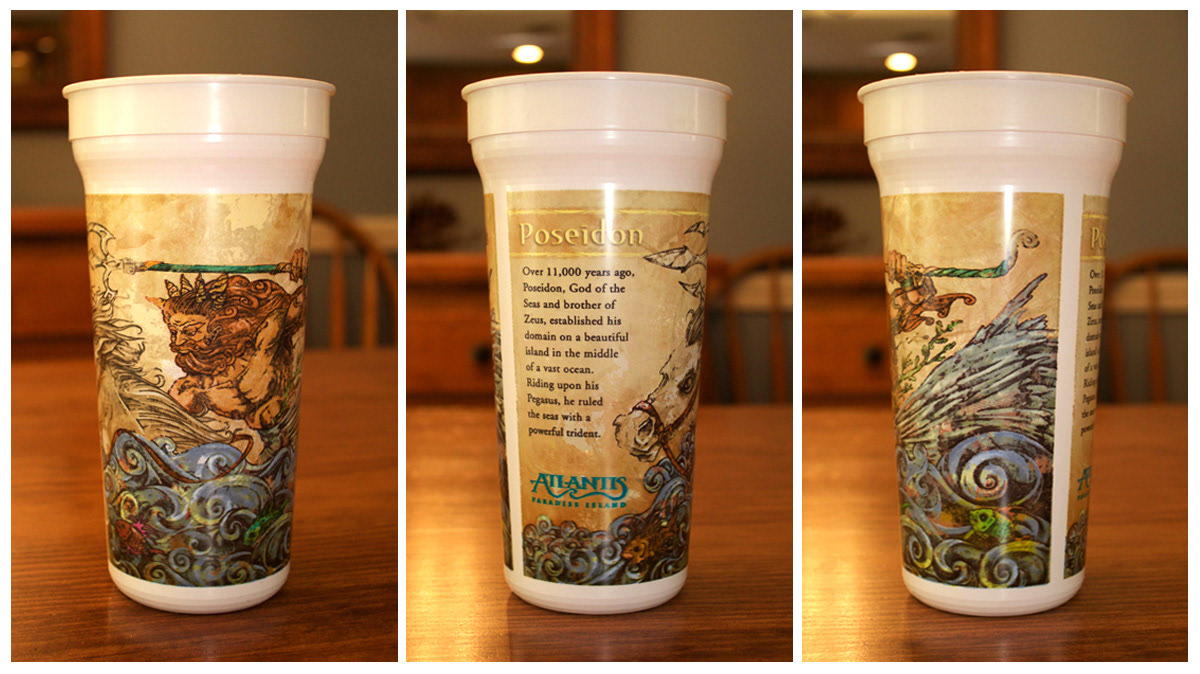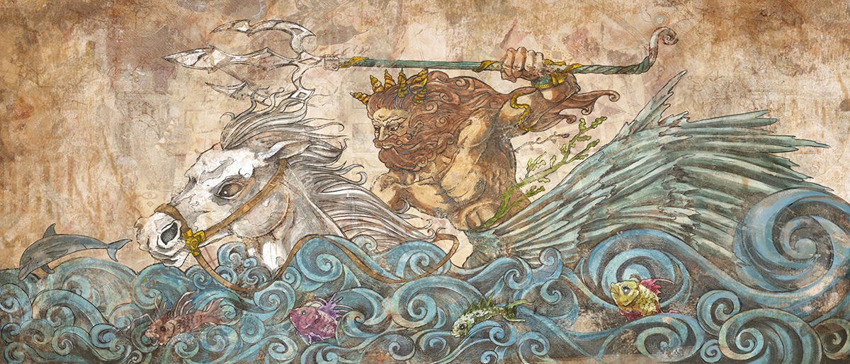 A series of greek god inspired collector cups, illustrated in an aged, painted on stone style.
