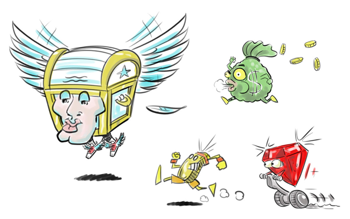 Sketches of various on-screen collectables - with a twist - these coins, gems and chests have personality and some don't want to be collected.